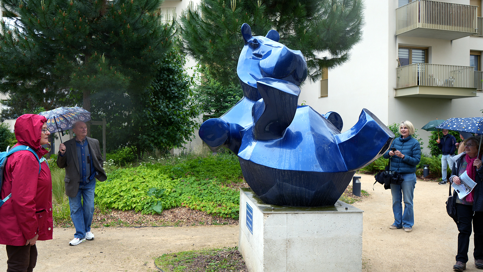 Le voici donc sur le dos, en train de se faire bronzer, de profiter de la vie, indifférent au monde qui l’entoure, niché au cœur d’une résidence du quartier de Moulon. Le choix de la couleur bleue renvoie à l’eau dans laquelle ce mammifère passe le plus clair de son temps.