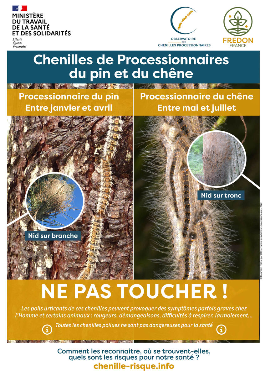 Lorsque ces deux types de chenilles processionnaires du pin et du chêne sont stressées par nos actions humaines, elles libèrent leurs poils urticants et volatiles qui peuvent provoquer chez l'homme des réactions allergiques, démangeaisons, toux, conjonctivites, etc. Et des risques plus graves pour les animaux domestiques en cas d'ingestion.