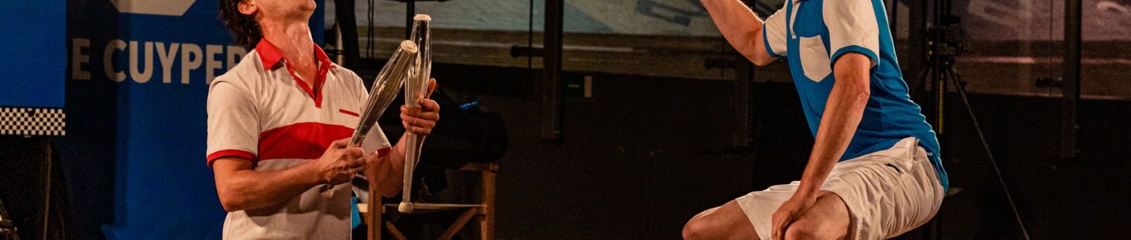 Dans un stade de sport tourbillonnant, deux frères jongleurs s'affrontent. Tous les codes des sports connus, moins connus et inventés sont utilisés : héroïsme et fair-play, blessures et sponsoring, dopage et règles contournées. Des supporters enthousiastes, un arbitre strict et un commentateur pas toujours objectif complètent le tableau. Une chose est sûre, un frère quittera l'arène en vainqueur et un autre en perdant.