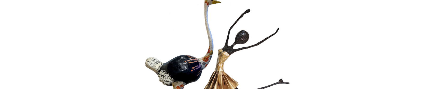 D’un côté Nicole et Aude travaillent à 4 mains depuis 2001, autodidactes, elles réinventent le papier mâché pour l’adapter à leur fantaisie. Papier journal, colle à papier peint et fil de fer deviennent entre leurs doigts un bestiaire coloré et plein d’humour. A la précision des formes elles ajoutent la malicieuse gaité de leurs collages.